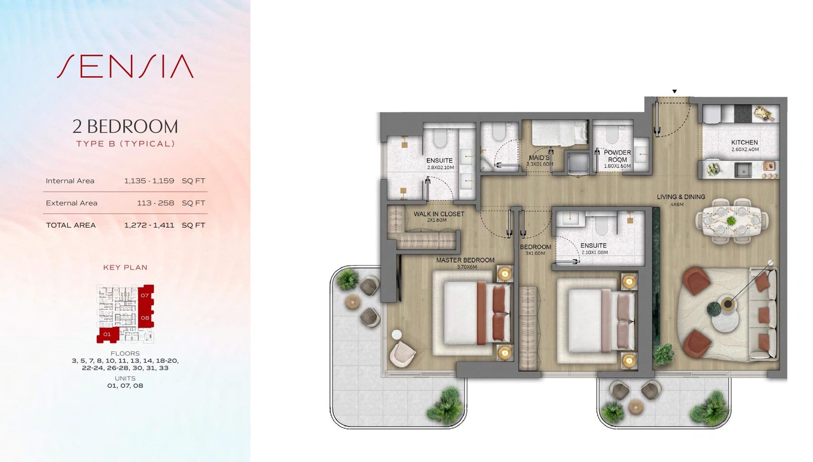- 1-Bedroom Apartments: Ranging from 700 to 1,000 sq.ft., these apartments are ideal for singles or young couples seeking a stylish, low-maintenance home.